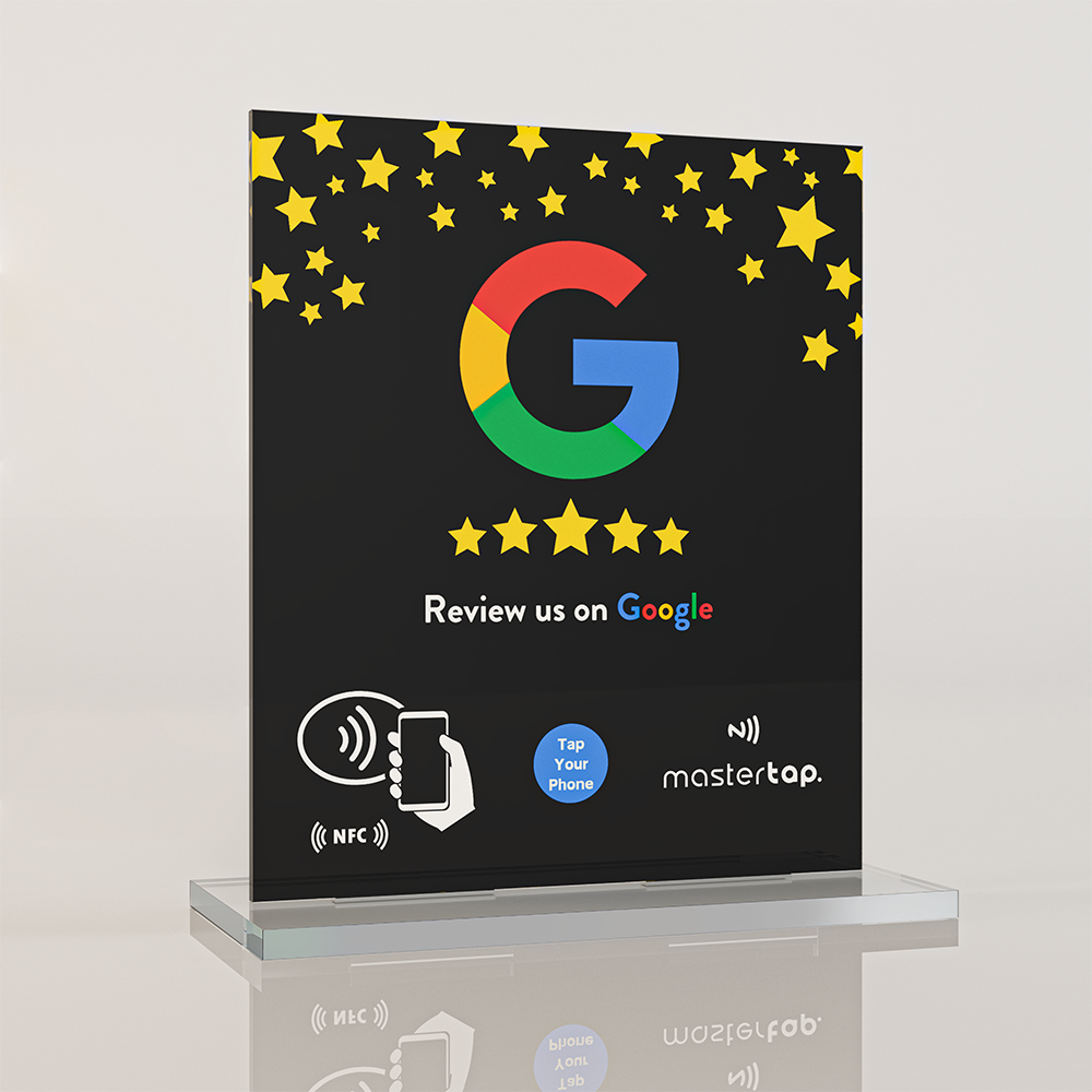 Αναβαθμίστε την εμπειρία των πελατών σας και ενισχύστε τη φήμη της επιχείρησής σας με το Google Review Επιτραπέζιο Stand από Plexiglass με NFC της MasterTap σε μαύρο χρώμα.